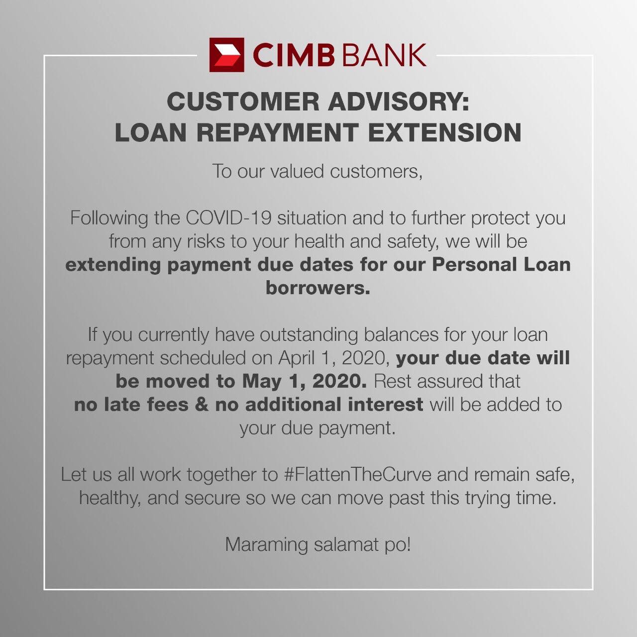 Cnn Philippines On Twitter Cimb Bank Extends Payment Due Dates For Personal Loan Borrowers Amid Luzon Wide Quarantine Due To Covid19 Pandemic Https T Co Sdo55hox53 Https T Co Gdvazbpsu9 Twitter